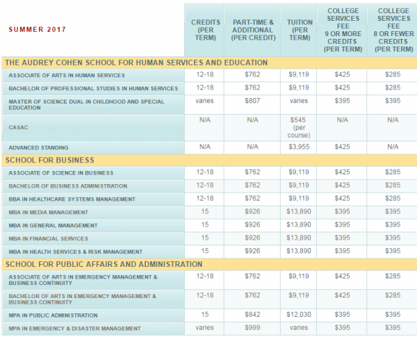 | 개설학과 | MCNY'S ACADEMIC PROGRAMS The Audrey Cohen School for Human Services & Education Associate of Arts, Human Services Bachelor of Professional Studies, Human Services Master of Science in Childhood Education Master of Science in Education - Dual Childhood Grades 1-6/Special Education Master of Science in Secondary Education CASAC Program School for Business Associate of Science in Business Bachelor of Business Administration AAS in Information Technology BBA in Information Technology Management BBA in Healthcare Systems Management MBA in Media Management MBA in Financial Services MBA in General Management MBA in Health Services and Risk Management School for Public Affairs & Administration AA in Emergency Management & Business Continuity BA in Emergency Management & Business Continuity MPA in Public Affairs and Administration MPA in Emergency and Disaster Management |